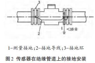 傳感器安裝在塑料管或內(nèi)壁有絕緣涂層或襯里的管道上。兩端應(yīng)安裝接地環(huán)(或帶接地極的短金屬管),然后用導(dǎo)線連接,使管內(nèi)流動(dòng)的介質(zhì)與大地短路。零電位。
